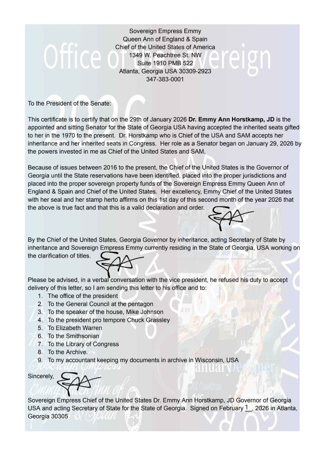 Dr. Emmy Ann Horstkamp, JD Chief of the USA, Sovereign Empress Emmy